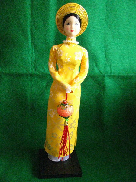 ตุ๊กตาหญิงเวียตนามในชุดประจำชาติ(Ao dai,อาวหญ่าย)เสื้อทำจากผ้าใหมสีสวย ตัวตุ๊กตาทำจากเรซิ่นพร้อมฐานตั้งทำจากไม้หุ้มด้วยผ้า ที่คอและใบหูทั้งสองข้างประดับด้วยลูกปัด มือถือโคมจีน มี 2 สีให้เลือกครับ(สีเหลือง,สีชมพูออกแดง) สูงประมาณ 30 cm และลูกค้าสามารถชำระค่าสินค้าได้ทุกช่องทางครับ