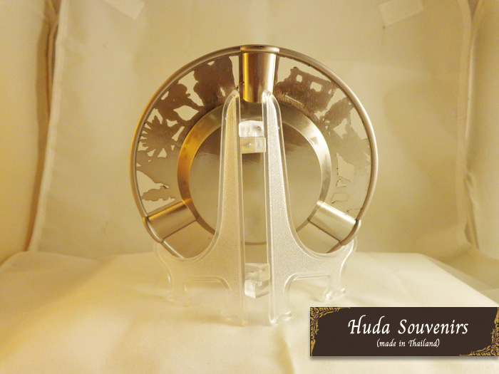 จานโชว์ สีทอง เนื้องานทำจากโลหะ ส่วนด้านบนนั้นเป็นลวดลายที่ชะหลุเป็นลวดลายต่างๆ รถตุ๊กๆ ช้าง รูปวัด ส่วนสีแดงตรงคำว่า Thailand นั้นเป็นเกร็ดทรายสีแดงโปรยรอบคำว่า Thailand สำหรับสินค้าตัวนี้จะมีขาตั้งโชว์เป็นแบบใสจะยิ่งทำให้ตัวจานโชว์นั้นเด่นขึ้น