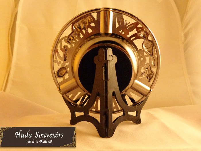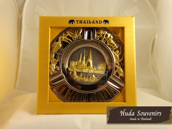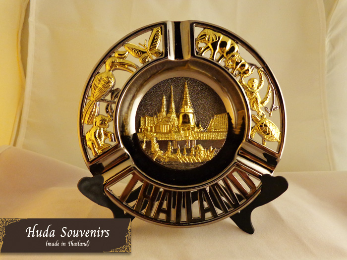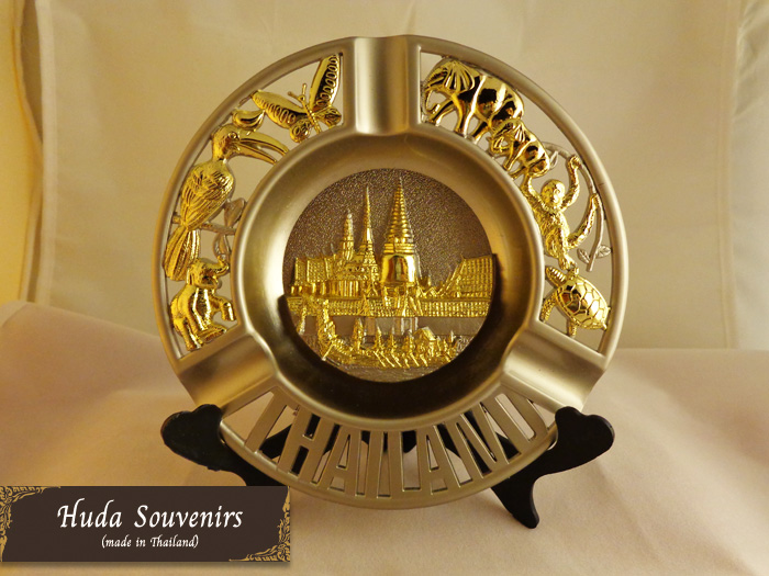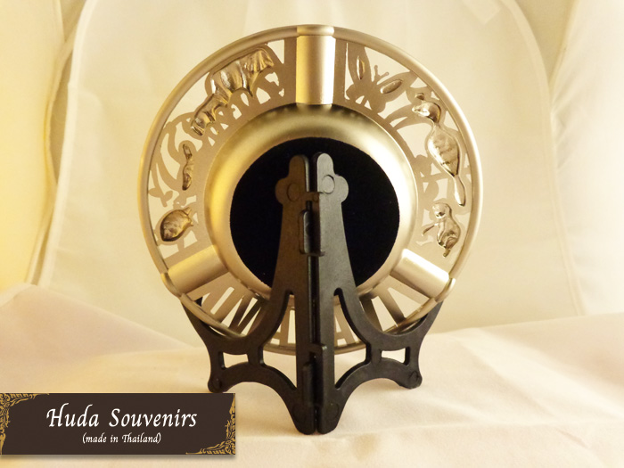ของขวัญปีใหม่ให้ลูกค้า จานโชว์ผิวเงา ด้วยกับความเงาทำให้สินค้าชิ้นนี้ดูสวยงามโดดเด่นยิ่งขึ้น ประดับประดาไปด้วย รูปสัตว์ต่างๆ ช้าง , ผีเสื้อ , เต่า , ลิง , นก และใจกลางที่เน้นความเป็นไทยกับวัดวาอารามและคำว่า THAILAND ด้านล่าง แถมด้วยขาตั้ง สำหรับตั้งโชว์ตัวงานเก็บรายละเอียดดีมาก กำมะหยี่สีดำตรงก้นจาน จัดลงในแพคเก็ตที่สวยงาม น้ำหนัก 250.00 กรัม มีให้เลือกสองสไตล์ คือแบบผิวมันเงา และผิวมันด้าน