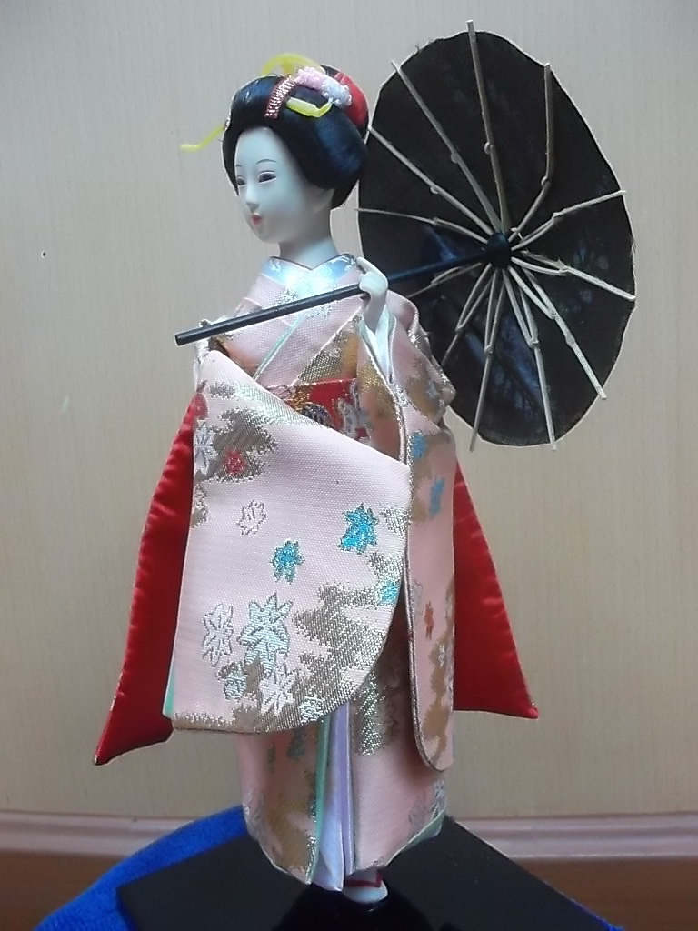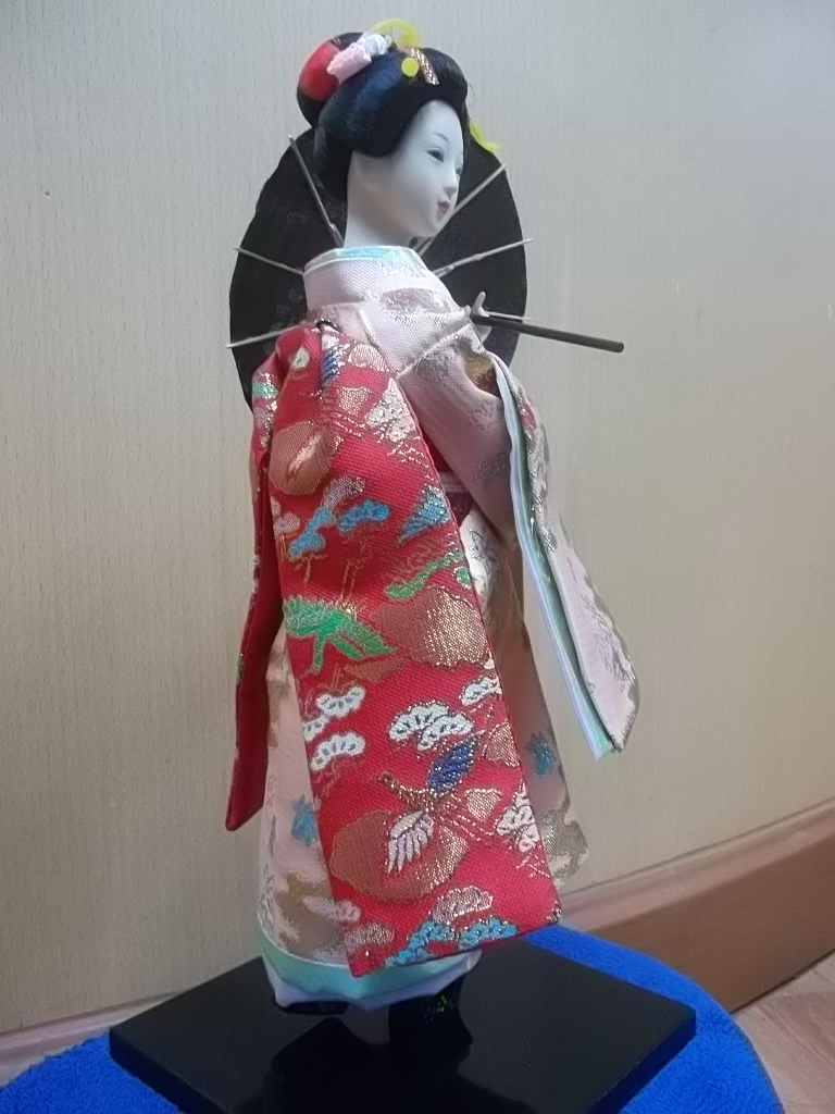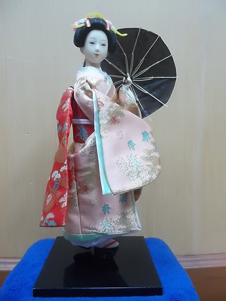 ตุ๊กตาสาวญี่ปุ่นใส่ชุดกิโมโน ท่ายืนถือร่มบนฐานไม้ ความสูงประมาณ 12 นิ้ว เป็นงานกึ่งแฮนด์เมด จากผ้า ไม้ และพลาสติก เหมาะสำหรับตั้งโชว์ หรือเป็นของขวัญคนสำคัญในวันสำคัญ