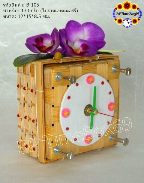นาฬิกาไ่ผ่สาน กล้วยไม้ (รหัส B-105) ด้านข้างประดับด้วยเม็ดคริสตัล สีแดง สลับขาว ขนาด 12*15*8.5 ซม. ใช้แบตเตอร์รี่ ขนาด AA 1 ก้อน น้ำหนัก 130 กรัม(ไม่รวมแบตเตอร์รี่) หากต้องการสั่งไปจำหน่าย ติดต่อได้ครับ [email protected] โทร. 090-648-4868
