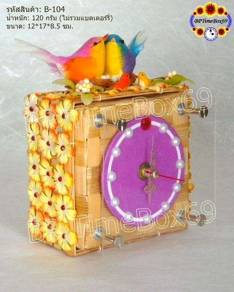 นาฬิกาไผ่สาน นกคู่แฟนซี (รหัส B-104) ด้านข้างดอกไม้เหลืองประดับเกสรเม็ดคริสตัล สีแดงสด ใช้ประดับ ตกแต่ง ให้เป็นของขวัญ ของฝาก หากต้องการสั่งไปจำหน่าย ติดต่อได้ครับนาฬิกาตั้งโต๊ะ ขนาด 12*17*8.5 ซม. ใช้แบตเตอร์รี่ ขนาด AA 1 ก้อน น้ำหนัก 120 กรัม(ไม่รวมแบตเตอร์รี่) หากต้องการสั่งไปจำหน่าย ติดต่อได้ครับ สนใจสอบถามเพิ่มเติม www.facebook.com/bptimebox69 [email protected] โทร. 090-648-4868