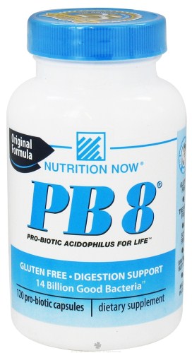 PB 8 Pro-Biotic Acidophilus For Life is a probiotic supplement from Nutrition Now. It is a combination of 8 types of "good" gut bacteria that supports your intestinal bacteria balance. Containing 14 billion good bacteria at time of production, PB 8 promotes healthy digestion, and supports immune system function. This formula utilizes Inulin as the microflora growth concentrate; Inulin is considered a prebiotic. PB 8 contains no artificial colors, flavors or preservatives, as well as no wheat (gluten), eggs, peanuts, tree nuts, soy or salt
