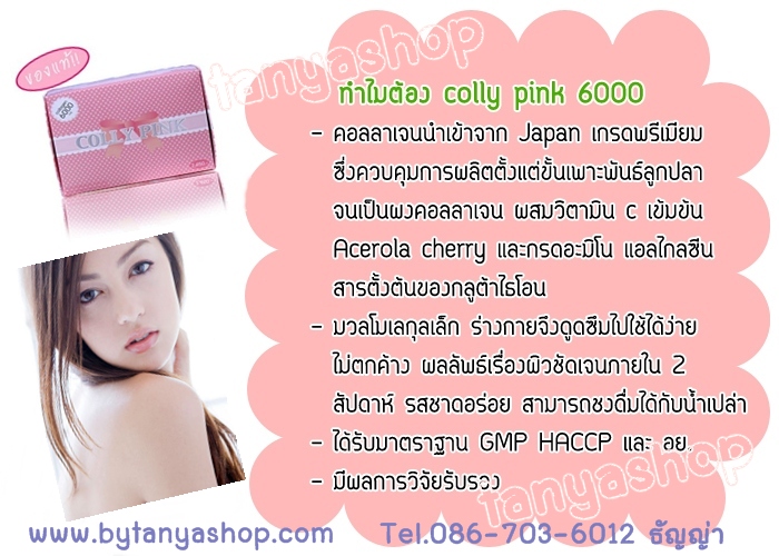 Colly Pink 6000 คอลลี่ พิงค์ 6000 มก. คอลลาเจนเกรดพรีเมี่ยม 6000 มิลลิกรัมผสมวิตามินซีเข้มข้นCollagen วัตถุดิบนำเข้าจากญี่ปุ่น !! (Colly Pinky 6000) รับประกันสวยเซี๊ยะในกล่องเดียว ใช้ได้ทั้งชายหญิง ผิวหน้าเนียนเรียบ รูขุมขนเล็กลง