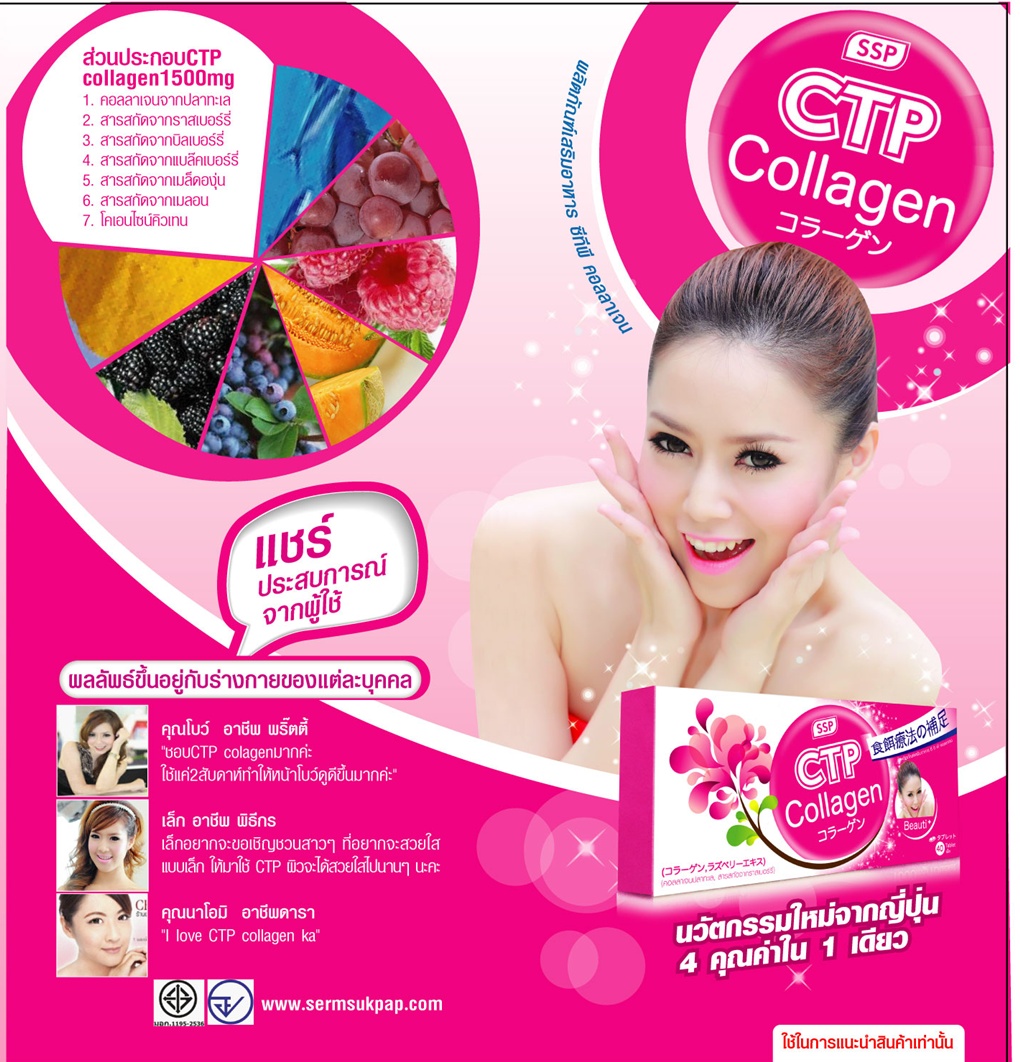 เหตุใดเราจึงควรรับประทานCTP Collagen? เสริมอาหาร ในอาหารทั่วไปที่เรารับประทานเป็นประจำนั้น จะมีคอลลาเจนอยู่ แต่ร่างกายไม่สามารถนำไปใช้ได้ เพราะโมเลกุลมีขนาดใหญ่ เพื่อจะให้ได้คอลลาเจนในปริมาณ 1,000 -3,000 มิลลิกรัมต่อวัน ที่เพียงพอต่อร่างกาย คุณต้องรับประทานอาหารในปริมาณที่มาก ๆ มีการวิจัยระบุว่า คอลลาเจนนั้นจะสามารถดูดซึมเข้าสู่กระเพาะอาหารได้ดีกว่าดูดซึมทางผิวหนัง การใช้ผลิตภัณฑ์บำรุงที่มีส่วนผสมของคอลลาเจนนั้นเป็นการยากมากหากต้องการให้ดูดซึมเข้าสู่ผิวหนังชั้นในได้ หากคุณต้องการสวยจากภายในหรือต้องการหลีกเลี่ยงการศัลยกรรมจึงควรรับประทานคอลลาเจนเท่านั้น