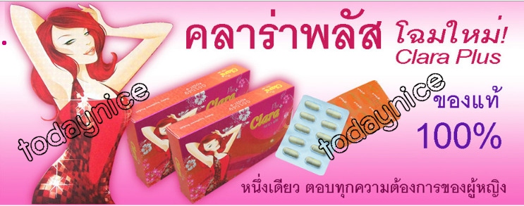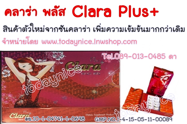 คลาร่า พลัส Clara Plus คลาร่า พลัส Clara+Plus คืนความสาว เพิ่มความสวย ไร้กลิ่นอับ ขาวใสทั้งตัว ผิวหน้าใสไร้สิวฝ้ากระ ฟิตหุ่นให้เฟิร์มกระชับทุกสัดส่วน ด้วยคุณสมบัติของคลาร่า พลัส Clara+Plusสูตรใหม่ล่าสุดพัฒนาเพิ่มความเข้มข้น เห็นผลชัดเจนยิ่งขึ้นแม้ทานเพียงกล่องแรก ผลิตภัณฑ์เสริมอาหาร Clara Plus คลาร่า พลัส จำหน่ายโดยบริษัทสตาร์ ซันไชน์ จำกัด เลขที่อย. 10-1-04741-1-0698 GMP.NO.1-4-15-05-11-00089 น้ำหนักสุธิ 12 กรัม (บรรจุ20 แคปซูล) ราคาปกติ 690 บาท ลดราคาเหลือ 500 บาท ซันคลาร่าเปลี่ยนชื่อใหม่แล้วเป็น คลาร่า พลัส Clara Plusผลิตจากสารสกัดธรรมชาติของแท้จากบริษัทสตาร์ ซันไชน์ จำกัด คลาร่า พลัส Clara Plus ตัวใหม่ด้วยสารสกัดละเอียดกว่าเดิมและดูดซึมดีกว่าเดิม เห็นผลเร็วและแรงกว่าเดิมหลายเท่า เห็นผลชัดเจนในกล่องแรก Clara Plus คลาร่า พลัสผลิตจากโปรตีนสารสกัดจากถั่วเหลือง,สารสกัดจากทับทิม,สารสกัดจากเปลือกสนและโคเอนไซม์ คิวเท็น วิธีรับประทาน : Clara Plus คลาร่า พลัส ครั้งละ 1 แคปซูล ก่อนอาหาร วันละ 1 ครั้ง