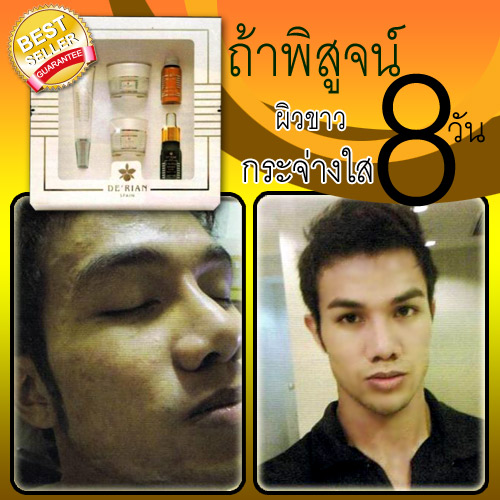 “ปกติผมเคยเป็นคนแพ้ง่าย เคยเป็นสิวเยอะมากจนทำให้มีจุดด่างดำ รอยสิว ที่หนักที่สุดเห็นจะเป้นหลุมสิว ขนาดยิงเลเซอร์ก้ยังไม่ดีขึ้น ตอนนี้ผมใช้เดอแรงค์ ยังไม่ถึง 2 เดือน หน้าผมเปลี่ยนแปลงแบบเห็นได้ชัดมากครับ หน้าผมขาวขึ้น รอยสิวและหลุมสิวดูดีขึ้นมาก ผลที่ได้จากการใช้เดอแรงค์ ผมพอใจยิ่งกว่าเลเซอร์อีกครับ” คุณนภัทร โภคาสัมฤทธิ์ (นักธุรกิจ)