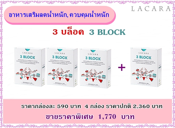 อาหารเสริมลดน้ำหนัก 3 บล็อค ซื้อ 3 แถม 1 ไม่ต้องอดอาหารก็ลดน้ำหนักได้ ช่วยคุณลดน้ำหนักอย่างปลอดภัย บล็อคแป้ง, ไขมัน, น้ำตาลได้ 40% และช่วยเผาผลาญไขมัน ปราศจากยาระบายและยาลดความอ้วน มีอย.