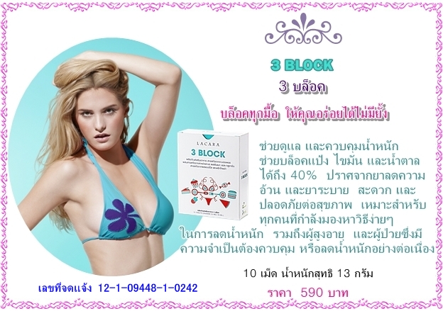 อาหารเสริม “3บล็อค” เป็นผู้ช่วยในการลดน้ำหนัก และช่วยควบคุมน้ำหนัก โดยจะบล็อคแป้ง ไขมัน และน้ำตาลได้ถึง 40% และปราศจากยาลดความอ้วน และยาระบาย สะดวกและปลอดภัยต่อสุขภาพของคุณ เหมาะสำหรับทุกคนที่กำลังมองหาวิธีง่ายๆ ในการลดน้ำหนัก รวมถึงผู้สูงอายุ หรือผู้ป่วยที่มีความจำเป็นต้องควบคุม หรือลดน้ำหนักอย่างต่อเนื่อง