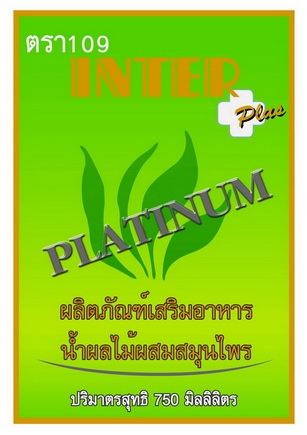 เครื่องดื่มน้ำผลไม้ผสมสมุนไพรเพื่อสุขภาพตรา 109 อินเตอร์พลัส แพลตตินั่ม บรรจุในขวดแก้วสีเขียว บล็อกโฟม กล่องสีทอง ได้รับการรับรองจากกรมวิทยาศาตร์และอย.เป็นที่เรียบร้อยแล้ว