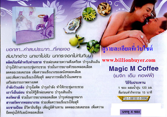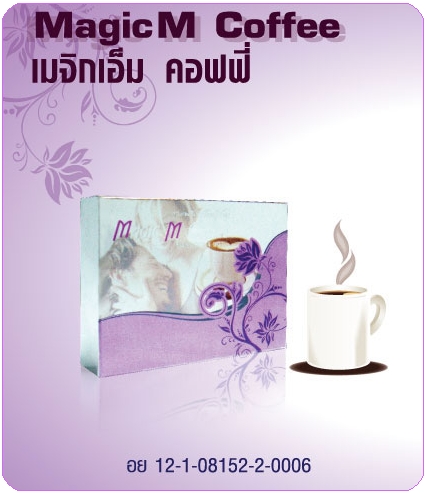 MAGIC M Coffee มีส่วนผสมของสารสกัดจากสมุนไพรเม็ดช่วยเพิ่มพลังให้กับผู้ชายที่รวดเร็วทำให้ไม่ต้องหงุดหงิดสร้างความแข็งแกร่งของความเป็นชายเป็นสินค้าใหม่ล่าสุดใช้ง่ายสะดวกเพียงฉีกซองชงกับน้ำร้อนและดื่มได้เช่นเดียวกับกาแฟทั่วไปอีกทั้งมีกลิ่นหอมและรสชาติที่ถูกใจคอกาแฟเป็นอย่างมากเพียงดื่มกาแฟสมุนไพรMagic M Coffee หนึ่งถ้วยก่อนเวลาที่ท่านต้องการปฏิบัติกิจ Magic M Coffee เมจิกเอ็มคอฟฟี่