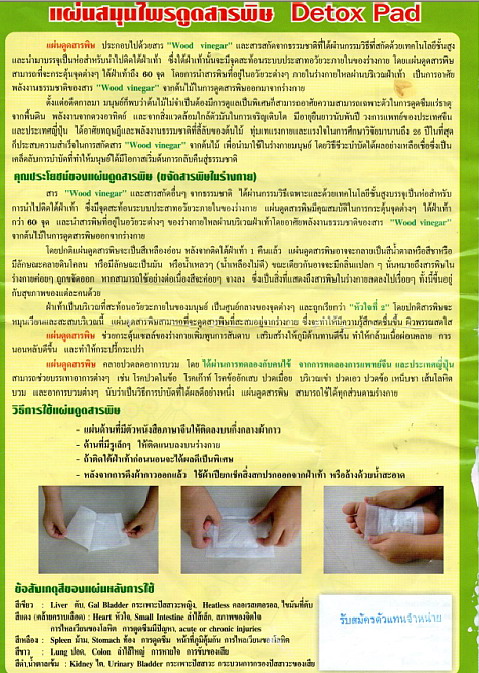 ลอกกระดาษกาวออกแล้วนำแผ่นสมุนไพร ด้านที่เป็นภาษาญี่ปุ่นติดลงบนแผ่นกาวตามแนวยาว ไปติดตามร่างกายนำส่วนต่างๆที่มีอาการ ( จะให้ได้ผลดีขึ้นหากติดฝ่าใต้ฝ่าเท้าทั้ง 2ข้างก่อนนอน) ทิ้งไว้ 6-10 ชม. แล้วลอกออกให้สังเกตสีและกลิ่นโดยปกติแผ่นสมุนไพรก่อนใช้จะเป็นเหลืองอ่อนและแห้งเนื้อสมุนไพรเป็นผง ติดใต้ฝ่าเท้าหลังจาก 6-10 ชม. จะคล้ำขึ้นแล้วสีกลิ่นและแข็งตัวมี ลักษณะจะแตกต่างกันไปขึ้นอยู่กับสภาพร่างกายของแต่ละบุคคลเช่นมีลักษณะ คล้ายดินโคลนหรือเป็นมัน (ไขมัน) หรือน้ำเหลวๆ (น้ำเหลืองไม่ดี) และอาจจะมีกลิ่นแปลกๆและสารพิษในร่างกายค่อยๆถูกขจัดออกหากใช้อย่างต่อเนื่อง ค่อยๆจางลงสีจะแสดงถึงสารพิษในร่างกายลดลงไปเรื่อยๆ ไม่ถึงเป็นสีขาวเพราะร่างกายของเรารับเอาสารพิษทุกวันเช่นจากอากาศจากอาหารเป็นต้น
