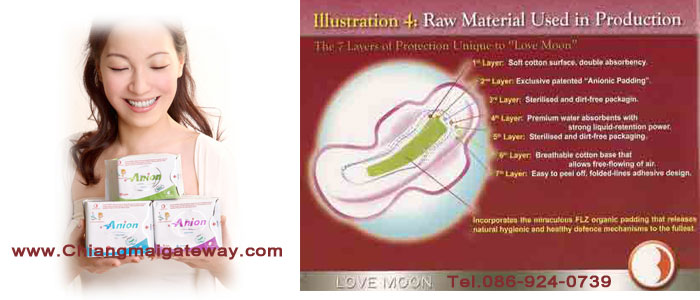 ::::ส่วนประกอบ 7 ชั้น:::: ชั้นที่ 1 ผิวหน้าผ้าฝ้าย Soft cotton ให้ความนุ่มนวลไม่ระคายเคืองต่อผิวที่บอบบาง ชั้นที่ 2 “แผ่นไอออนประจุลบ” ที่ได้รับการจดสิทธิบัตร ชั้นที่ 3 แผ่นสำลีสะอาดผ่านขบวนการฆ่าเชื้อ และ ปกป้องฝุ่นละออง ชั้นที่ 4 สารดูดความชื้น ที่มีความสามารถสูง ในการเก็บกัก ของเหลว ชั้นที่ 5 แผ่นสำลีสะอาดผ่านขบวนการฆ่าเชื้อ และป้องกันฝุ่น ละออง ชั้นที่ 6 ผ้าฝ้ายที่มีรูระบายอากาศ ชั้นที่ 7 กาวที่ง่ายต่อการลอกออก เป็นกาวที่ได้รับการออกแบบมา เพื่อยึดเกาะโดยเฉพาะ แผ่นไอออนประจุลบ (ที่ได้จดสิทธิบัตรแล้ว) "Negative ions" ไอออนประจุลบได้รับการวิจัยแล้วว่าสามารถช่วยให้สุขภาพดีขึ้น แผ่นไอออนประจุลบในทุกๆแผ่นของผ้าอนามัย Love Moon ทำให้สุขภาพในชีวิตประจำวันของคุณดีขึ้น ในแต่ละแผ่นจะปล่อยไอออนประจุลบมากถึง 5800 ลูกบาศก์ เซนติเมตร ซึ่งได้รับการวิจัยจากนักวิทยาศาสตร์ว่า ช่วยต่อต้านเชื้อโรค กำจัดแบคทีเรีย odor, enha ผลลัพธ์ที่แตกต่างจากผ้าอนามัยทั่วไป คือ : 1. สามารถซึมซับได้ดีกว่าผ้าอนามัยธรรมดา 3-4 เท่า จึงไม่ซึมเปื้อนและไม่ต้องเปลี่ยนบ่อย 2. เจลคอลลาเจน ไม่ต้องเสี่ยงจากสารเคมีที่ใช้ทำกระดาษรีไซเคิล 3. ดับกลิ่นเหม็นจากการตกขาวด้วย anion ไม่เสี่ยงต่อการแพ้น้ำหอมดับกลิ่น 4. ยับยั้งการเพิ่มจำนวนเชื้อแบคทีเรียและไวรัส ลดการอักเสบ การติดเชื้อ ลดความเสี่ยงต่อการเป็นมะเร็งปากมดลูก 5. บรรเทาอาการปวดท้อง 6. ทำจากสำลีจึงนุ่มและไม่อันตรายต่อผิว 7. ไม่มีแถบกาวติดหลังใช้ ไม่ทำให้กางเกงในสกปรก 8. อากาศถ่ายเทได้ดี เนื่องจากมีรูระบาย 9. แถมฟรี แผ่นตรวจสุขภาพภายในด้วยตนเอง รวมอยู่ในชุด กลางวัน กลางคืน และแผ่นอนามัยสำหรับทุกวัน เห็นความแตกต่างได้หลังใช้ 2 อาทิตย์ 10. พกพาสะดวก ป้องกันฝุ่นและน้ำได้ด้วยซองทันสมัยที่ใช้ระบบเปิดปิดด้วยแถบกาว โดย ผ้าอนามัย lovemoon นี้ ผลิตจากเส้นใยธรรมชาติปราศจากเคมี บรรจุอยู่ในหีบห่อที่มิดชิด ป้องกันความชื้น กันฝุ่นละอองและป้องกันเชื้อโรค เป็นผ้าอนามัยที่บางแต่สามารถดูดซับน้ำได้สูงมากกว่า หลายยี่ห้อถึง 3-4 เท่า แผ่นประจุลบ (Anion) มีคุณสมบัติที่ดีมาก ช่วยด้านสุขอนามัยได้ดีเยี่ยมและยังช่วยแก้ปัญหาปวดประจำเดือน, มีตกขาว, ช่องคลอดมีกลิ่น, มีอาการคัน (แพ้ผ้าอนามัย), ไม่สะอาดในช่องอนามัย, อึดอัด รำคาญผ้าอนามัย ซึมซับไม่ดี เฉอะแฉะ เปลี่ยนผ้าอนามัยบ่อยๆ แผ่นอนามัย เลิฟมูน จะแก้ปัญหาเหล่านี้ให้คุณได้ทั้งหมดและมากยิ่งกว่า เลิฟมูนจึงกลายเป็นผลิตภัณฑ์ ที่ไม่มีใครเหมือน สมดังสโลแกนที่ว่า "ผู้หญิงทุกคนจะรัก…เลิฟมูน...