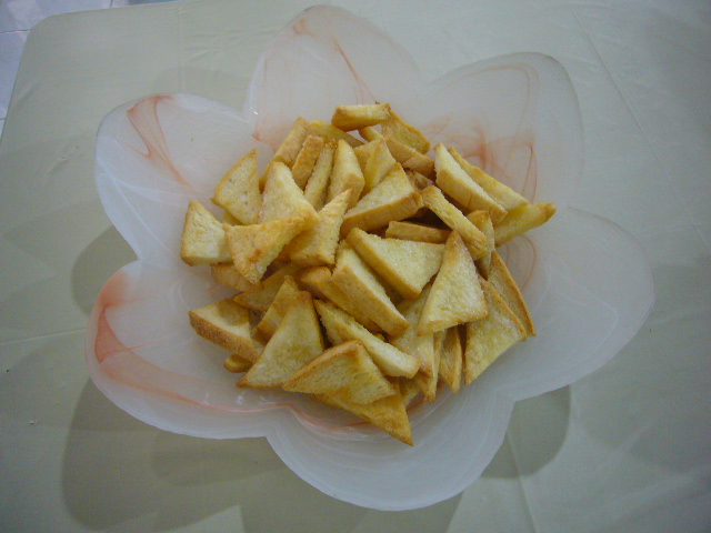 ขนมปังทาเนยอบกรอบ ทาด้วยเนยแท้ๆ พร้อมน้ำตาล รสหวานกำลังดี อบกรอบ ขนมปังตัดเป็นรูปสามเหลี่ยม ขนาดพอดีคำ ขายเป็นกิโลกรัม กิโลละ 150 บาท