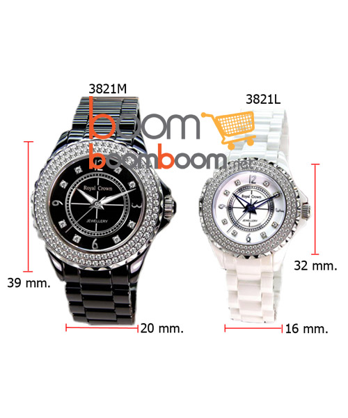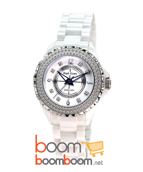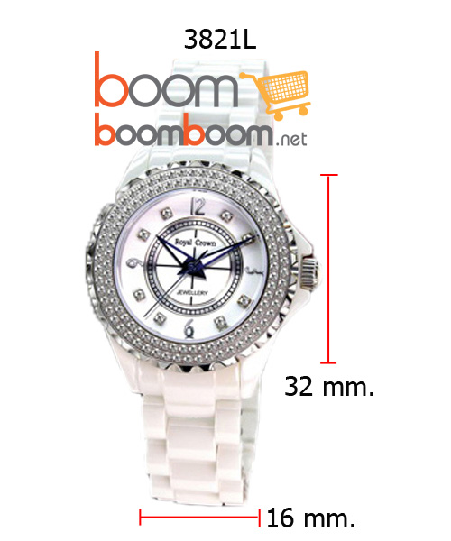 นาฬิกา Royal Crown รุ่น 3821L คุณสมบัติหน้าปัด Ceramic อย่างดีสีขาว ฝังด้วยเพชร CZ แท้ สวยงามโดดเด่น ดูมีระดับ
