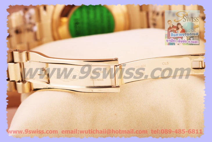 - ตัวเรือนและสายทำจากสี Yellow Gold 18K ยากต่อการซีดจาง สายแบบ President สามข้อตัน ข้อล๊อคสายแบบบานพับ แน่นหนา