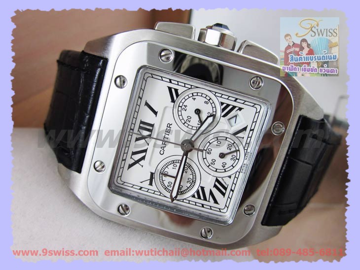 * Cartier Santos 100 Chronograph จับเวลาได้จริง กระจก Crytral Sapphire กันรอยขีดข่วน กับงานมิเรอร์อิมเมจ - ขนาดตัวเรือน Meduim Size 44.2x35.6 mm. เกรดมิเรอร์อิมเมจ ถอดบล๊อกจากของแท้ 1:1 - หน้าปัด Silvered Opaline Dial ตัวเลขโรมัน เข็มเวลาเป็นแบบพรายน้ำ - กระจก Crytral Sapphire กันรอยขีดข่วน ขอบหน้าปัดแบบยึดน๊อตบล๊อคกระจก - ตัวเรือนทำจาก Steel แข็งแรงทนทาน สายหนังแท้ลายจระเข้ มีสีดำและสีน้ำตาลให้เลือก ข้อล๊อคแบบ Twin Lock - ฝาหลังทึบสลักโลโก้เหมือนแท้ ขันเกลียวใส่ซีลกันน้ำ เม็ดมะยมปั้มโลโก้เหมือนแท้ - การทำงานระบบ Quartz Chronograph Movement จับเวลาได้จริง ระบบ Fly Back ความเที่ยงตรงสูงสุด (ของแท้ก็ระบบ Quartz ครับ) - แสดงวันที่ตำแหน่ง 4-5 นาฬิกา, แสดงเวลา 24ชั่วโมงตำแหน่ง 3 นาฬิกา, แสดงเวลาวินาทีปกติตำแหน่ง 6 นาฬิกา, แสดงการจับเวลาเป็นนาทีตำแหน่ง 9 นาฬิกา - เข็มยาววินาทีแสดงการจับเวลา ปุ่มด้านบนควบคุมการเริ่มจับ-หยุดเวลา ปุ่มกลางตั้งวันที่และเวลา ปุ่มด้านล่างสำหรับรีเซ็ตเข็มจับเวลา(Fly Back) " ถ้าต้องการ CARTIER Santos 100 Chronograph "Black" (44.2x35.6 mm.)Steel งานมิเรอร์สวิส เครื่องสวิสแท้ จับเวลาได้จริง สามารถติดต่อสอบถามได้ครับ "