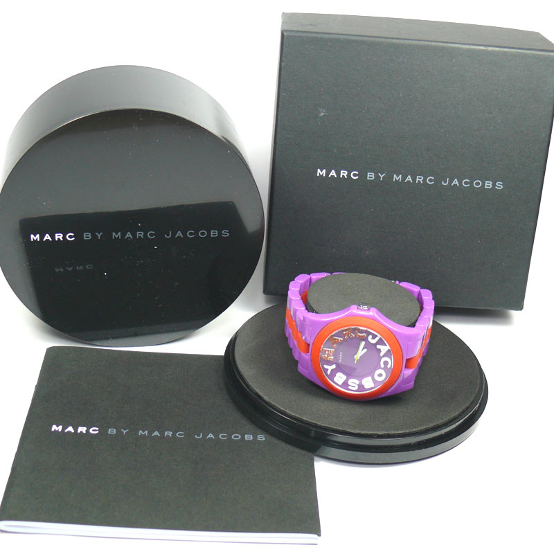 Playful and punctual. Be both with this Rivera watch by Marc by Marc Jacobs. purple nylon bracelet with center links of red silicone. Round stainless steel case covered in purple with red bezel. Purple dial features white and red crystal-accented logo letters at markers, white hour and minute hands and lime-green second hand. Quartz movement. Water resistant to 30 meters.