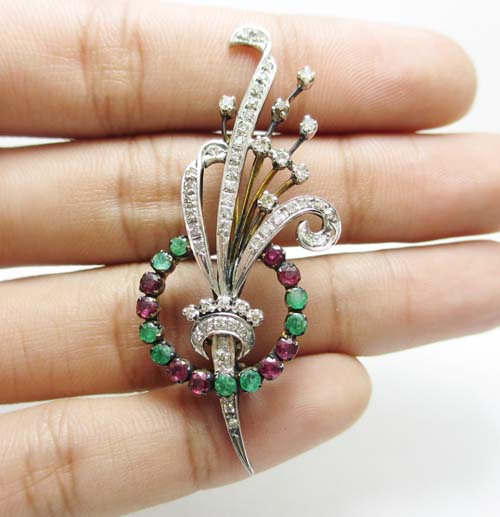 เข็มกลัดเพชร ทับทิม มรกต งานK 2 สี เพชรกุหลาบ ตัวเรือนน้ำหนักโดยประมาณ 4.90 กรัม (ชั่งทั้งชิ้นงาน) เพชรแท้ พลอยแท้ ความกว้างโดยประมาณ 2.20 *5.30เซ็นติเมตร