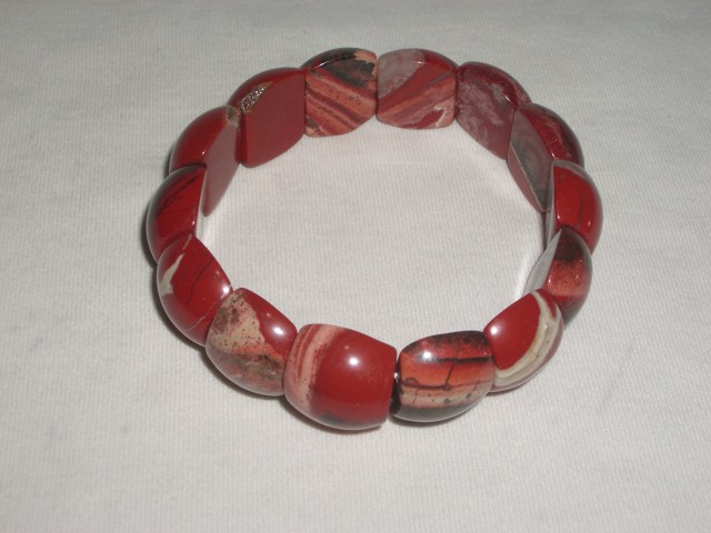สร้อยข้อมือ ทำจากหินJasper เจียรไนเป็นชิ้นบาง ทรงสี่เหลี่ยมหลังเต่า เรียงร้อยด้วยเส้นเอ็นยืด