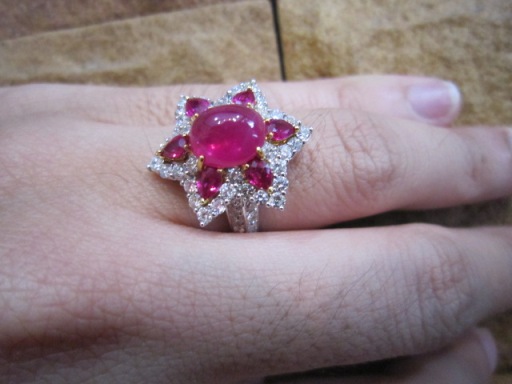 แหวนทับทิมพม่าหลังเบี้ยเนื้อแก้ว สีสวยมาก ทับทิมเม็ดกลางหนัก 1.35กะรัต ประดับด้วยทับทิมเจียรรอบ 0.92 กะรัต และเพชรเหลี่ยมเกสรน้ำขาว ไฟดี น้ำหนักเพชรรวม 1.32 กะรุัต วงนี้ทับทิมสีสวยหวานมาก ๆ ค่ะ