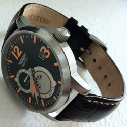 หน้าปัดใหญ่สีดำตัดกับส้ม และมีช่องเข็มวินาที และช่องบอกวันที่และกลางวัน-กลางคืน