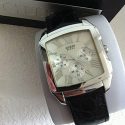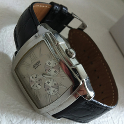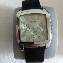 ขายนาฬิกาข้อมือสำหรับสุภาพบุรุษ แบรนด์ GUESS รุ่น 95232 G1 มือสอง สายหนังแท้สีดำ ตัวเรือน Stainless Steel สีเงินวาว หน้าปัด Chronographic บอกวัน วันที่ และกลางวัน-กลางคืน เหมาะสำหรับใส่ทำงาน ถ้าถูกใจ ต่อรองราคาได้อีกนิดหน่อยครับ