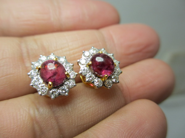 ต่างหูทับทิมพม่า เนื้อแก้ว สีแดงเลือดนก หลังเบี้ย ล้อมเพชร ทอง 90%