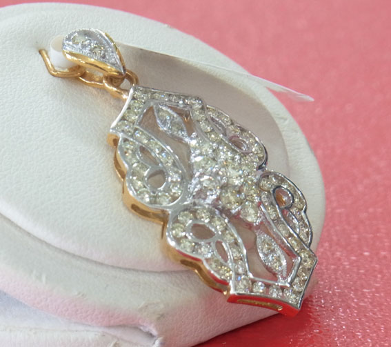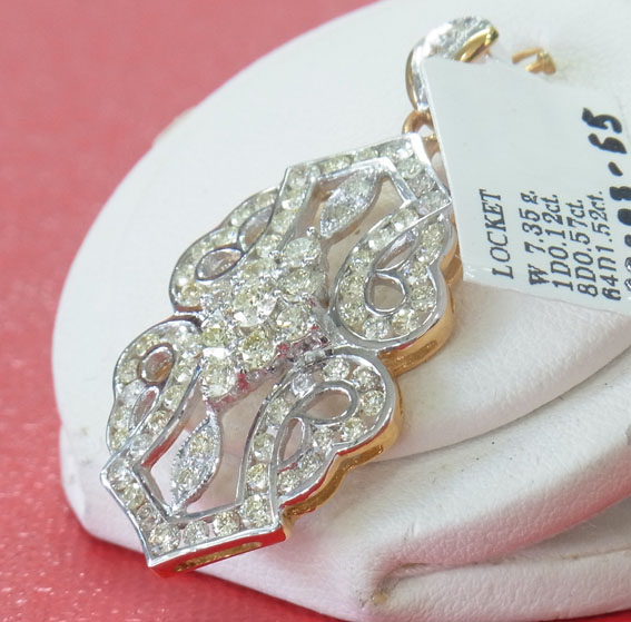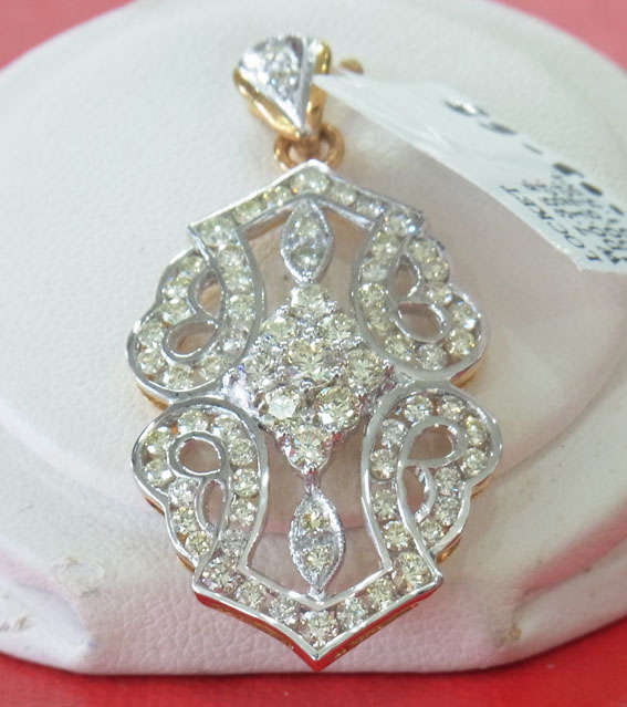 L5922 ขายจี้เพชรแบบโบราณ ทองคำแท้ น้ำหนัก 7.35 กรัม เพชรเม็ดกลาง น้ำหนัก 0.12 ct เพชรล้อม 8 เม็ด น้ำหนักรวม 0.57 ct เพชรล้อมเป็นลาย น้ำหนักรวม 1.52 ct รวม 64 เม็ด ราคา 85,000 บาท