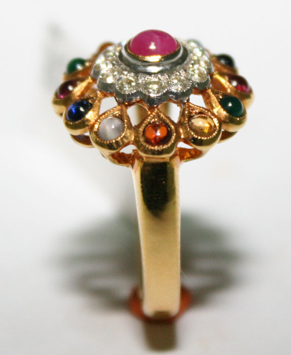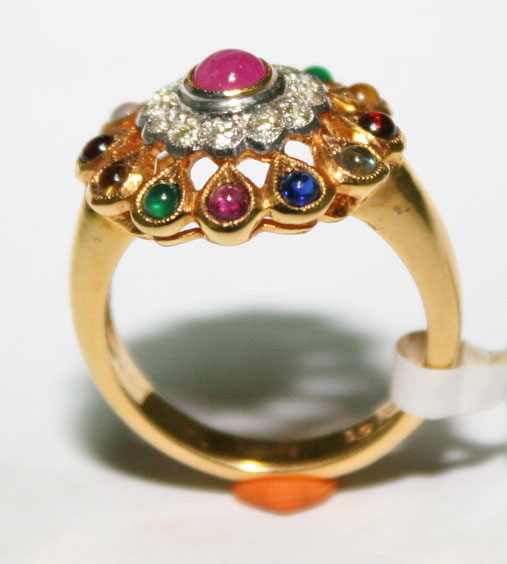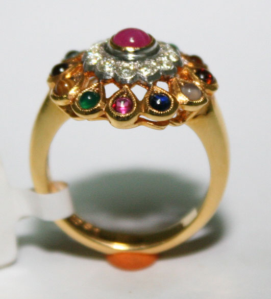 แหวนนพรัตน์ พลอยถูกต้องตามตำรา วงเล็กน่ารัก เหมาะสำหรับคนนิ้วเล็ก ทองคำแท้ 90% น้ำหนัก 8.07 กรัม มีทับทิมตรงกลางล้อมเพชรแท้ พลอย 13 เม็ด น้ำหนักรวม 1กะรัต เพรชแท้ 12 เม็ด น้ำหนักรวม 0.31 กะรัต