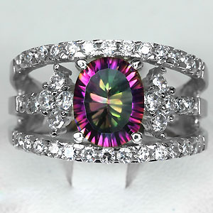 ลักษณะ : แหวนเงินประดับพลอยแท้โทปาสหลากสี น้ำหนักพลอย 1.15 กะรัต ขนาดของพลอย 10x8xมม.น้ำงาม สีสวยมาก ไฟดี ล้อมด้วยซัฟไฟร์ขาวขนาด 1.7x1.7 มม. 30 ชิ้นและเพชรสวิสขนาด 2.5x2.5 มม. 8 ชิ้น