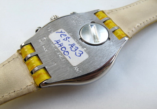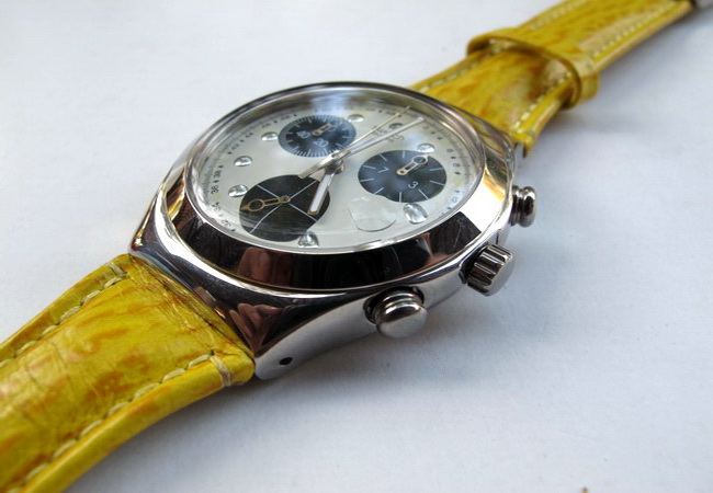 SWATCH IRONY Chronograhp YSC406 SecretAgentYellow เรือนใหญ่ ระบบ chrono 3ปุ่ม 4เข็ม ใช้งานได้เต็มระบบ มีวันที่บอกพร้อม ขนาดหน้าปัดประมาณ 46 mm. สายหนังแท้ สวยจริง ราคาเต็ม 4400 บาท ขายราคา 3000 บาท (ของใหม่ค่ะ)