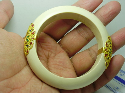 กำไลงาช้าง ทองฉลุลายทองลงยา หน้ากว้าง 15 มิล ทรงท้องปลิง งานเก่า สวย ตัวเรือนน้ำหนักโดยประมาณ 49.53 กรัม (ชั่งทั้งชิ้นงาน)