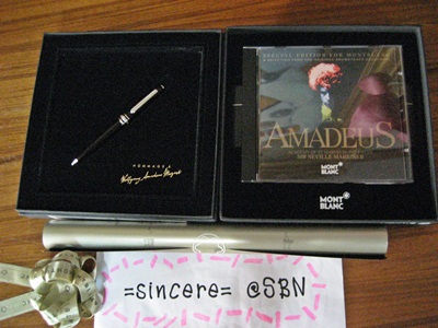 ปากกา MontBlanc รุ่น Platinum W.A. Mozart Ballpoint pen ของใหม่ เป็นปากกาหัวลูกลื่น รุ่นพิเศษ มี CD เพลงโมสาร์ทแถมอยู่ในกล่องสวยหรู ของใหม่ในช้อปขาย 13,500 บาท วันนี้เอามาขายถูกค่ะ อุปกรณ์ครบทุกชิ้น กล่อง ,คู่มือ ,CD Mozart ,กระดาษห่อของขวัญพร้อมโบว์ ,ถุงกระดาษ และคูปองแกะสลักชื่อฟรี ขาย 7,200 บาท