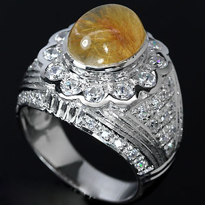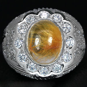 ลักษณะ : แหวนเงินชุบทองคำขาวประดับพลอยแท้ไหมทอง เป็นพลอยแท้น้ำงาม เจียรเป็นทรงรูปไข่หลังเบี้ย น้ำหนักพลอย 5.70 กะรัต ขนาดพลอย 11.5x9.2x6.9 มม. ล้อมด้วยพลอยเนื้อแข็งขนาด 1.7x1.7xมม. 20 ชิ้น ขนาด 1.5x1.5xมม. 20 ชิ้นและเพชรสวิสเกรดเอขนาด 2.5x2.5xมม. 12 ชิ้น แบบเรียบหรู ทันสมัยใส่ได้ทุกโอกาส งานฝีมือช่างจิวเวลลี่จันทบุรี ตัวเรือนเป็นเงินน้ำหนักเงิน 8.99 กรัมขนาดแหวนเบอร์ 59 หรือ size 8.75