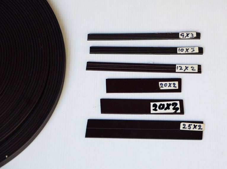 แม่เหล็กเส้น หรือแถบแม่เหล็ก มีขนาดดังนี้ (กว้าง x หนา) 9 x 3 , 10 x 3 , 12 x 2 , 20 x 2 , 20 x 3 , 25 x 2 แบ่งขายเป็นเมตร หรือขายยกม้วน( 50 เมตร) ได้ตามต้องการ