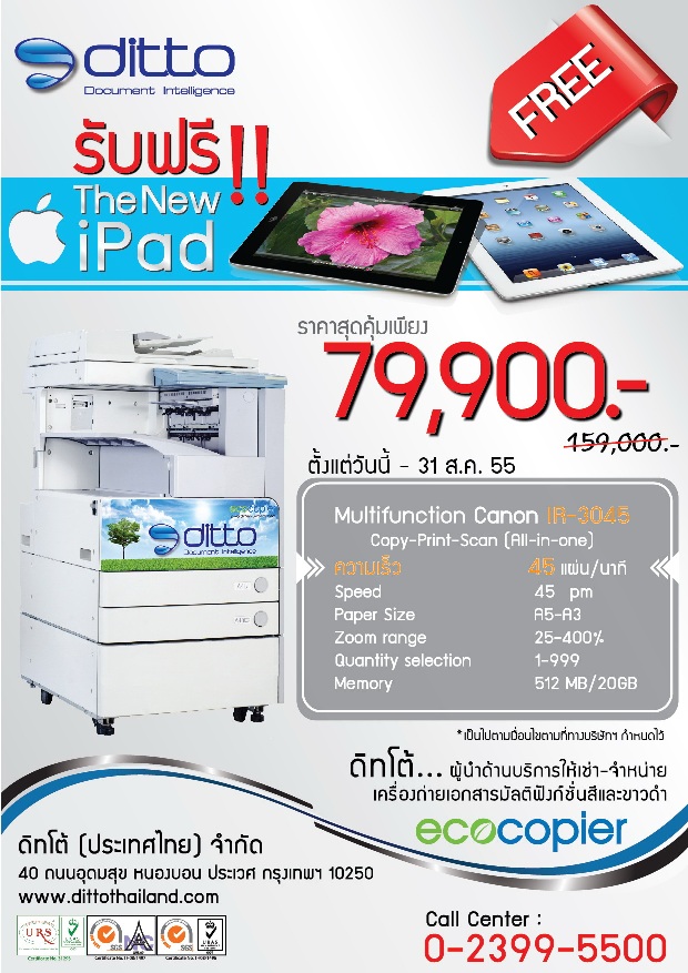 โปรโมชั่นพิเศษ!! Canon IR-3045 IF (Free!! New iPad) ราคาสุดคุ้มเพียง 79,900.- ตั้งแต่วันนี้ - 31 ส.ค. 55 Multifunction Canon IR-3045 IF Speed : 45 แผ่น/นาที Paper Size : A5-A3 Zoom range : 25-400% Quantity selection : 1-999 Memory : 512 MB / 20 GB