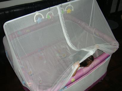 ขายเตียงเด็กพร้อมเบาะนุ่ม มีมุ้งและโมบายให้ พับได้