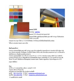 จำหน่าย แผ่นคอมโพสิต ALU/PE/AL ขนาด W X L 1.25 X 2.44 M ความหนา MM X 0.3 MM สีมาตรฐาน Bright Silver เคลือบสีด้วยระบบทันสมัยได้มาตรฐาน เทคโนโลยี จาก USA ของสี Du Pont ดัดโค้งงอ 30 องศา ได้ไม่ฉีกขาด สีไม่หลุดล่อน ทนแดด ทนฝน ง่ายต่อการดูแลรักษา รับประกันคุณภาพ 10 ปี (คุณภาพพื้นผิว)