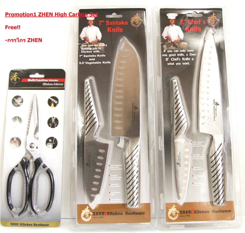 มีดครัวยี่ห้อดัง “ZHEN” มีด Premium มีดเชฟ มีดดังขายดีในประเทศ อเมริกา, ญี่ปุ่น และ ไต้หวัน มีดดังขายดีใน EBAY,Amazon มีด ZHEN (เซน) เป็นมีดดีไซส์ญี่ปุ่นและใช้วัสดุจากประเทศญี่ปุ่น โรงงานมีด ZHEN ผ่านมาตรฐานการผลิตมีด ISO9001 จากประเทศเยอรมัน มีด ZHEN ทำด้วยวัสุคุณภาพ100% Japanese Steel การันตีคุณภาพ ด้วยการรีวิวจาก เชฟชั้นนำจากต่างประเทศ http://www.youtube.com/watch?v=rucOacBspJQ http://www.youtube.com/watch?v=DtQWEWGFCEI (รีวิวจากเวป http://www.chefs-resources.com/) http://www.youtube.com/watch?v=AebFxDJ3CvI http://www.youtube.com/watch?v=v-0lelT5kdw http://www.youtube.com/watch?v=ps2kFCbT_JY ZHEN มีแบ่งเป็น 3 รุ่น ดังนี้ 1. ZHEN High Carbon Knife ส่วนผสมเหล็ก (X50CR-15MOV) ค่าความแข็งที่ HRC 56-58 สามารถ ดูรายละเอียดมีด ZHEN HRC หรือ High Carbon เพิ่มเติม ได้ที่หน้านี้ http://www.zhenthailand.com/onlineproducts/hrc โดยปรกติแล้ว มีดจะมีทำมาจากวัสดุ ดังนี้ -Stainless Steel -Carbon Steel และ High Carbon Steel ที่ดีกว่า 2 ชนิดข้างต้น และ ZHEN ใช้เหล็ก High Carbon Steel จากประเทศญี่ปุ่น 100% เหล็กมีคุณสมบัติที่ไม่แข็ง และไม่อ่อนเกินไป ง่ายต่อการลับคมกว่ามีดทั่วไปและคมนานกว่ามีดชนิดอื่นๆ ด้วยเอกลักษณ์ดีไซส์เฉพาะตัวของมีด ZHEN ทำให้รุ่น High Carbon เป็น Whole steelคือ เหล็ก ทั้งด้าม ง่ายต่อการใช้งาน และทำความสะอาด มีจุดเด่นที่น้ำหนักBalance และดีไซส์สวยงาม ราคา อยู่ที่ 2000.00 บาท มีด 2 เล่ม ต่อชุด - Santoku Knife 5” และ Santoku Knife 7”ราคา 2000.00 บาท - Chef Knife 8” และ Utility Knife 4.5”ราคา 2000.00 บาท Promotion1 ZHEN High Carbon Set พิเศษ เมื่อซื้อมีด ZHEN High Carbon จำนวน 2 Sets ราคา รวม 4,000.00 บาท แถมฟรีกรรไกร อเนกประสงค์จาก ZHEN ทำด้วย Japanese Steel 1 อัน มูลค่า 1,500.00 บาท ยังมีมีด ZHEN High Carbon รุ่นอื่นๆ ดังนี้ Nikiri 7” ราคา 1,350.00 บาท Bread Knife 9” ราคา 1170.00 บาท Bread Knife 10” ราคา 1300.00 บาท 2. ZHEN 3 Layers Knife(ใช้เหล็ก V Gold 10 จากประเทศญี่ปุ่น) ค่าความแข็ง HRC 60-62 สามารถ ดูรายละเอียดมีด ZHEN 3 Layers เพิ่มเติม ได้ที่หน้านี้ http://www.zhenthailand.com/onlineproducts/3layers เหล็ก V Gold10 หรือ VG-10 ให้ความแข็งแรงทนทาน และความคมที่ยาวนานกว่าเหล็กชนิดอื่นรวมทั้ง รูปแบบมีด ที่มีเอกลักษณ์เฉพาะตัวของมีด ZHEN ที่สวยงามและคงทน ด้ามมีดทำจากไม้ Mikataดีไซด์สวยงาม รีวิวมีด ZHEN 3 Layers VG-10 http://www.youtube.com/watch?v=ps2kFCbT_JY http://www.youtube.com/watch?v=rucOacBspJQ ราคาเริ่มต้นที่ 1,460.00 – 3,735.00 บาท เท่านั้น ซึ่งปรกติมีดรุ่นนี้ ราคาเริ่มต้นราวๆ 3000+ Paring Knife 3.5” มีปลอกเปลือก ราคา 1,460.00 บาท Utility Knife 4.5” มีดอเนกประสงค์เล็ก ราคา 1,575.00บาท Santoku Knife 7” มีดเชฟอเนกประสงค์ สไตล์ญี่ปุ่น ราคา 2,475.00 บาท Chef Knife 8” มีดเชฟอเนกประสงค์ สไตล์ฝรั่ง ราคา 2,590.00 บาท Carving Knife 8” มีดแล่ปลา ราคา 2,360.00 บาท Promotion2 ZHEN 3 Layers Set พิเศษ เมื่อซื้อมีด ZHEN 3 Layers Set ดังนี้