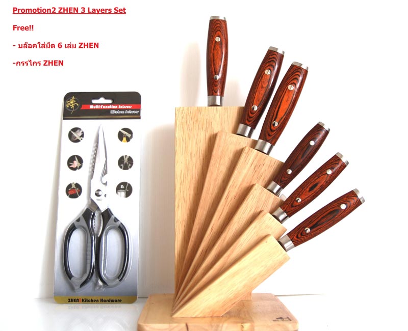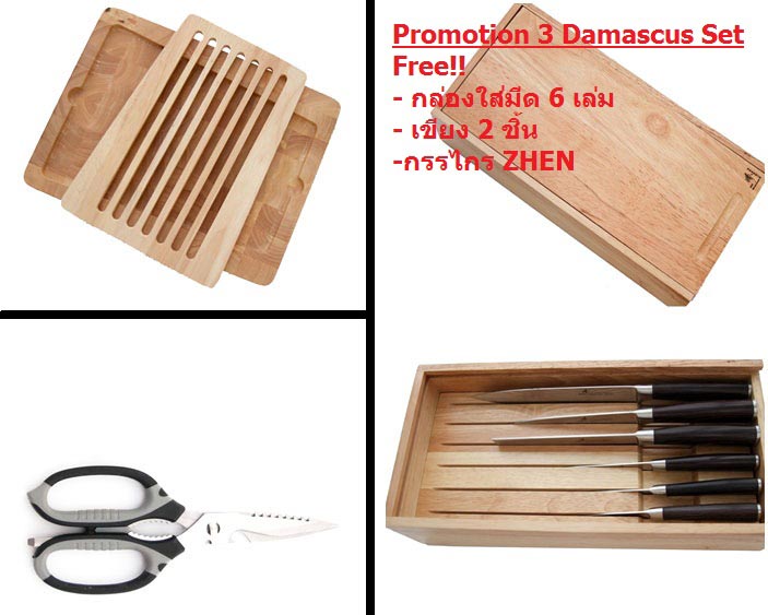 ราคา รวม 11,920 บาท แถมฟรีของแถมมูลค่ากว่า 3,500.00 บาท 1.บล๊อคมีดใส่มีดได้ 6 เล่ม ดีไซส์สวยงาม มูลค่า 2,000.00บาท 2. กรรไกร อเนกประสงค์จาก ZHEN ทำด้วย Japanese Steel 1 อัน มูลค่า 1,500.00 บาท ยังมีมีด ZHEN 3 Layers รุ่นอื่นๆ ดังนี้ Santoku Knife 7” ราคา 2,475.00 บาท Chef Knife 8” ราคา 2,590.00 บาท Chef Knife 9” ราคา 3,015.00 บาท Chef Knife 10” ราคา 3,240.00 บาท Chef Knife 12” ราคา 3,735.00 บาท เอาไว้สำหรับแล่ปลา หรือ เนื้อที่ใหญ่ขึ้น ตามความถนัดของเชฟ มีมีดปังตอ All Purpose ราคา 1,710.00บาท Slicer6.5” ราคา 1,710.00 บาท Slicer 7.75” ราคา 2,160.00 บาท Bone Chopper 7.75” ราคา 2,385.00 บาท Bone Chopper 7.75” ราคา 2,385.00 บาท ด้ามทำจากไม้โอ๊ค มีด Garnishing Garnishing Knife 3.5” ราคา 585.00 บาท Garnishing Knife 4” ราคา 675.00 บาท Garnishing Knife 5” ราคา 810.00 บาท 3. ZHEN Damascus Knife 67 Layers มีดที่สืบทอดตำนานการตีดาบซามูไรญี่ปุ่นมีที่ทำมาจาก เหล็ก VG10 ผสมกับแร่หิน Damascus ที่หายาก มีมูลค่าสูงในตลาด มีด ZHEN มีชั้นเหล็ก 67 Layers รูปแบบสวยงาม คงทน เหมาะสำหรับมืออาชีพค่าความแข็ง HRC 60-62 สามารถ ดูรายละเอียดมีด ZHENDamascus เพิ่มเติม ได้ที่หน้านี้ http://www.zhenthailand.com/onlineproducts/damascus หรือรีวิวมีด ZHENDamascus http://www.youtube.com/watch?v=v-0lelT5kdw http://www.youtube.com/watch?v=AebFxDJ3CvI http://www.youtube.com/watch?v=DtQWEWGFCEI ราคาเริ่มต้นที่ 2,630.00 – 6,975.00 บาท เท่านั้น ซึ่งปรกติมีดรุ่นนี้ ราคาเริ่มต้นราวๆ 4000+ Paring Knife 3.5” มีปลอกเปลือก ราคา 2,630.00 บาท Utility Knife 4.5” มีดอเนกประสงค์เล็ก ราคา 2,880.00บาท Santoku Knife 5” มีดเชฟอเนกประสงค์ขนาดเล็ก สไตล์ญี่ปุ่น ราคา 3,310.00 บาท Santoku Knife 7” มีดเชฟอเนกประสงค์ สไตล์ญี่ปุ่น ราคา 6,165.00 บาท Chef Knife 8” มีดเชฟอเนกประสงค์ สไตล์ฝรั่ง ราคา 6,660.00 บาท Carving Knife 8” มีดแล่ปลา ราคา 5,690.00 บาท Promotion3 ZHEN Damascus Set พิเศษ เมื่อซื้อมีด ZHEN Damascus Set ดังนี้