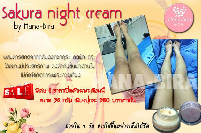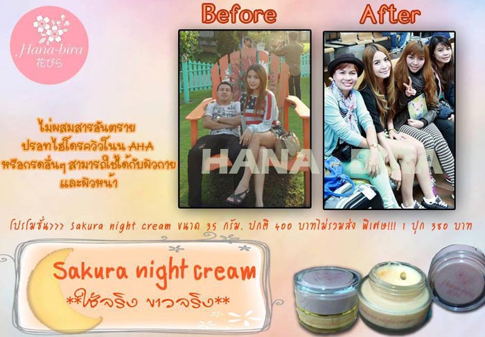 1. "Sakura night cream” ครีมบำรุงผิว สามารถใช้ทาหน้าได้ ทาตัวได้ ด้วยสารสกัดจากกลีบดอกซากุระ ช่วยลดเลือนกระ จุด ด่างดำทั้งหลายได้ลึกล้ำ และโคจิกเบอร์รี่ ช่วยให้ผิวขาวกระจ่างใส รวดเร็วกว่ากรดวิตามินอื่นๆหลายร้อยเท่า 380 บาท ฟรี ems