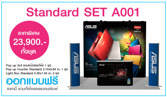 อุปกรณ์ออกบูธสินค้า,ป้ายโฆษณาต่าง ๆ และอุปกรณ์ออกบูธสำเร็จรูปมากมาย ทั้ง บูธ , Roll up, Pop up, pull frame, Backdrop, Counter Promotion, โต๊ะชงชิม, X Banner, Back Wall, Poster Stand, Standee Borad ,Brochure stand ฉากนิทรรศการ ออกบูธ ฯลฯ
