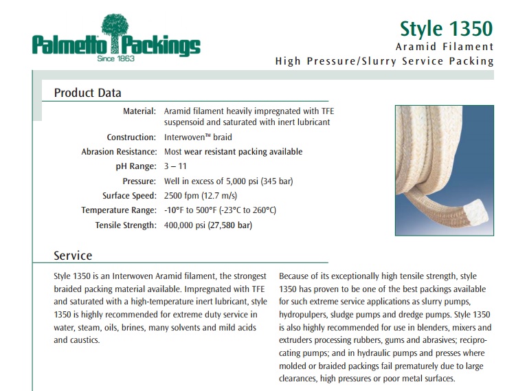 ทางเราห้างหุ้นส่วนจำกัด คิมเทค เทคโนโลยี เลขทะเบียนพานิชย์ 0103539003141 นำเข้า และจำหน่ายปะเก็นเชือกเคฟล่าร์เคลือบเทปล่อน หรือ kevlar gland packing with ptfe impregnated ยี่ห้อ palmetto รุ่น style 1350 เป็นปะเก็นเชือกที่มีส่วนประกอบเป็น aramid fiberหรือ เคฟล่าร์ หรือ kevlar ที่ถือได้ว่าเป็นวัสดุในการผลิตปะเก็นเชือกที่แข็งแรงที่สุด โดยเส้นใยเคฟล่าร์จะถูกทำให้ชุ่ม หรือเคลือบ(impregnated) ด้วย ptfe ในรูปของ ptfe suspensoid จากนั้นถูกทำให้อิ่มตัว (saturated) ด้วยสารหล่อลื่นที่เฉื่อยต่อสารเคมี inert lubricant ปะเก็นเชือกเคฟล่าร์เคลือบเทปล่อนมีคุณสมบัติที่ดีในการมีค่า tensile strength หรือค่าต้านทานแรงดึงสูงสามารถใช้กับงานหนักๆ ได้ดี วัสดุ: ปะเก็นเชือกเคฟล่าร์เคลือบเทปล่อน หรือ kevlar gland packing with ptfe impregnatedยี่ห้อ palmetto style 1350 ผลิตจากเส้นใย aramid filament หรือ aramid fiber หรือเส้นใยเคฟล่าร์ (kevlar) เคลือบด้ว ptfe suspensoid และสารหล่อลื่นที่่เฉื่อยต่อปฏิกิริยาเคมี (inert lubricant) การใช้งาน: เนื่องจากคุณสมบัติที่ทนทานต่อแรงดึงได้สูง (high tensile strength) จึงสามารถใช้ปะเก็นเชือกเคฟล่าร์เคลือบเทปล่อน หรือ kevlar gland packing with ptfe impregnated ยี่ห้อpalmetto style 1350 กับงานหนักๆ ได้ดี เช่น slurry pump, hydropulper, sludge pumps, dredge pumps ในอุตสาหกรรมที่เกี่ยวข้องกับสารเคมีเช่น อุตสาหกรรมกระดาษ พวก paper stock นอกจากนี้แนะนำให้ใช้ปะเก็นเชือกเคฟล่าร์เคลือบเทปล่อนกับ blender, mixer, reciprocating pump รวมถึง hydraulic pump นอกจากนี้ปะเก็นเชือกเคฟล่าร์ผสมเทปล่อนยังสามารถใช้งานได้ดีกับน้ำ, น้ำมัน, ไอน้ำ, น้ำเกลือ, กรดอ่อน คุณสมบัติจำเพาะ: อุณหภูมิ: ปะเก็นเชือกเคฟล่าร์เคลือบเทปล่อน หรือ kevlar gland packing with ptfe impregnated สามารถใช้งานได้ในช่วงอุณหภูมิ: (-23) ถึง 260 องศาเซลเซียส ความดัน: ปะเก็นเชือกเคฟล่าร์เคลือบเทปล่อน หรือ kevlar gland packing with ptfe impregnated สามารถทนความดันได้มากกว่า 5000 psi Shaft surface speed: ปะเก็นเชือกเคฟล่าร์เคลือบเทปล่อน หรือ kevlar gland packing with ptfe impregnated สามารถใช้งานได้ที่ shaft surface speed 2,500 fpm pH Range: ปะเก็นเชือกเคฟล่าร์เคลือบเทปล่อน หรือ kevlar gland packing with ptfe impregnated สามารถใช้งานได้ในช่วง pH Range: 3-11 tensile Strength: ปะเก็นเชือกเคฟล่าร์เคลือบเทปล่อน หรือ kevlar gland packing with ptfe impregnated มีค่าต้านทานแรงดึง หรือ tensile strength สูงถึง400,000 psi ซึ่งเรายังมีปะเก็นเชือก Palmetto ในรุ่นอื่นๆ นอกเหนือจากที่กล่าวข้างต้นไว้บริการท่าน (ทางเราไม่ได้สต็อกสินค้าไว้ในทุกรุ่นทุกขนาด แต่ทางเราสามารถสั่งนำเข้ามาให้ท่านได้ตามเงื่อนไขการสั่งซื้อที่ตกลงกัน) ท่านสามารถสอบถามข้อมูลเพิ่มเติม โดยติดต่อเรา คิมเทค เทคโนโลยีได้ที่ อีเมลล์ [email protected]