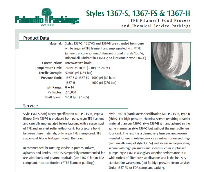 จำหน่ายปะเก็นเชือกเทปล่อน หรือ teflon gland packing ยี่ห้อ palmetto รุ่น style 1367s