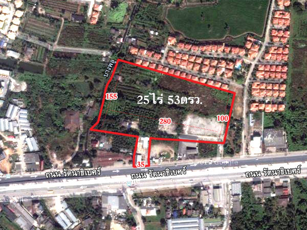 เหมาะสำหรับสร้างหมู่บ้าน คอนโด ...ฯลฯ ข้อมูลการเดินทาง จากถ.งามวงศ์วาน มุ่งหน้าถ.รัตนาธิเบศร์ ข้ามสะพานพระนั่งเกล้า ตรงไป ก่อนถึงแยกบางพลู 400 เมตร ที่ดินอยู่ฝั่งตรงข้าม โดยกลับรถใต้สะพานแยกบางพลู เนื้อที่ 25 ไร่ 53 ตรว. ตารางวาละ 120,000 บาท (ผู้ขายออกค่าใช้จ่ายในการโอนทั้งหมด)