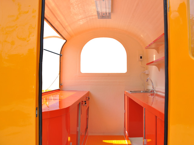 - พื้นของตัวร้านชั้นล่างสุดปูด้วยพื้นเหล็กเพิ่มความแข็งแรง ทับด้วยพื้นไม้เพื่อการยึดเกาะเคาน์เตอร์กับร้านค้า และปูทับชั้นบนสุดด้วยไฟเบอร์กลาสเพื่อความสวยงามและสามารถทำความสะอาดง่าย </p>
