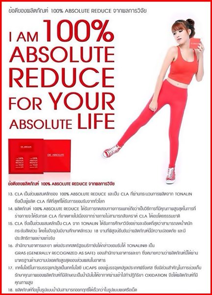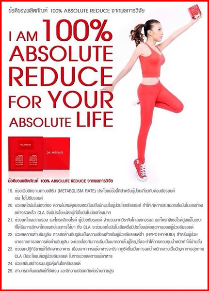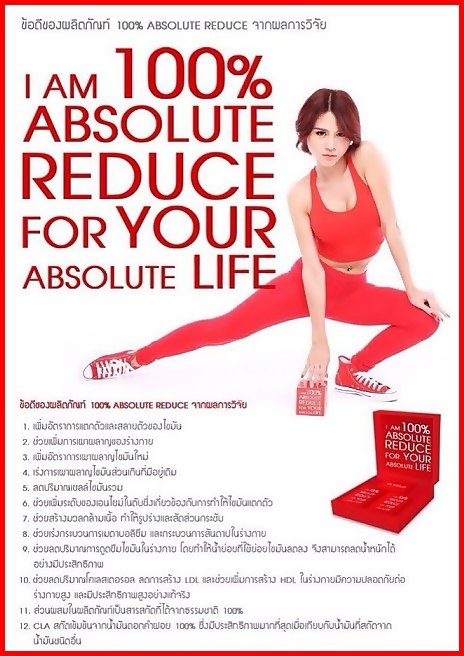 100% ABSOLUTE REDUCE DR.ABSOLUTE คือ ผลิตภัณฑ์อาหารเสริมลดน้ำหนัก คุณภาพเกรดพรีเมี่ยม วัตถุดิบนำเข้าจากประเทศฝรั่งเศส สารสกัดบริสุทธิ์จาก CIA (CONJUGATED LINOLEIC ACID) และ CAPSICUM EXTRACT ซึ่งเป็นสารสกัดจากธรรมชาติ 100% ช่วยลดไขมัน สลายเซลลูไลท์ ช่วยลดน้ำหนักส่วนเกิน กระชับสัดส่วน โดยเฉพาะบริเวณหน้าท้อง ต้นแขน ต้นขา โดยทำหน้าที่อย่างอ่อนโยนต่อร่างกาย ไม่ก่อให้ร่างกายเกิดภาวะตึงเครียด กระวนกระวายใจเต้นแรง ไม่ก่อให้เกิดอาการคอแห้ง กระหายน้ำ วิงเวียนศรีษะ และสามารถทานอาหารได้อย่างปกติ และเมื่อหยุดรับประทานไม่ก่อให้เกิดอาการโยโย่ เอฟเฟค (YOYO EFFECT)