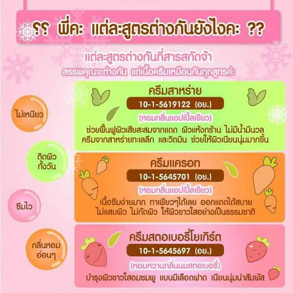 (หอมกลิ่นแอปเปิ้ลเขียว)เนื้อซึมง่ายมาก ทาเพียวๆได้เลย ออกแดดได้สบายไม่แสบผิว ไม่กัดผิว ให้ผิวขาวใสอย่างเป็นธรรมชาติ ครีมสตอเบอรี่โยเกิร์ต เลขที่จดแจ้ง10-1-5645697