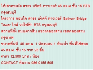 ให้เช่าคอนโด สาธร บริดจ์ ทาวเวอร์ 45 ตร.ม ชั้น 15 BTS กรุงธนบุรี